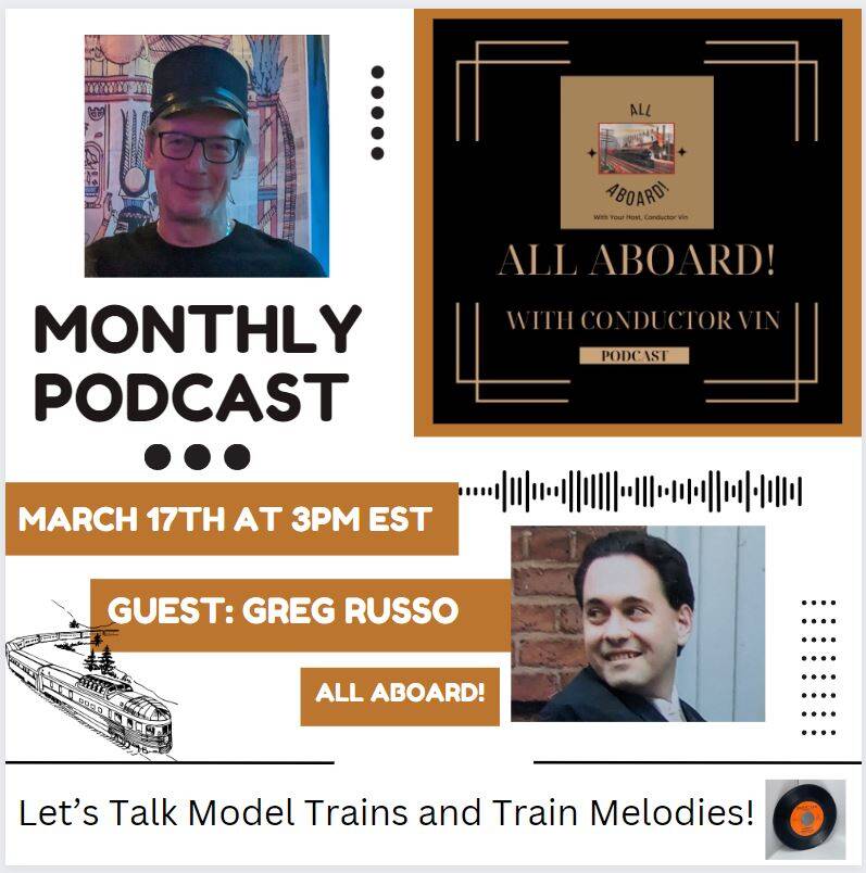 Coming March 17th at 3pm EST! The All Aboard with Conductor Vin Podcast with Guest, Greg Russo! Come talk trains and tunes with us!